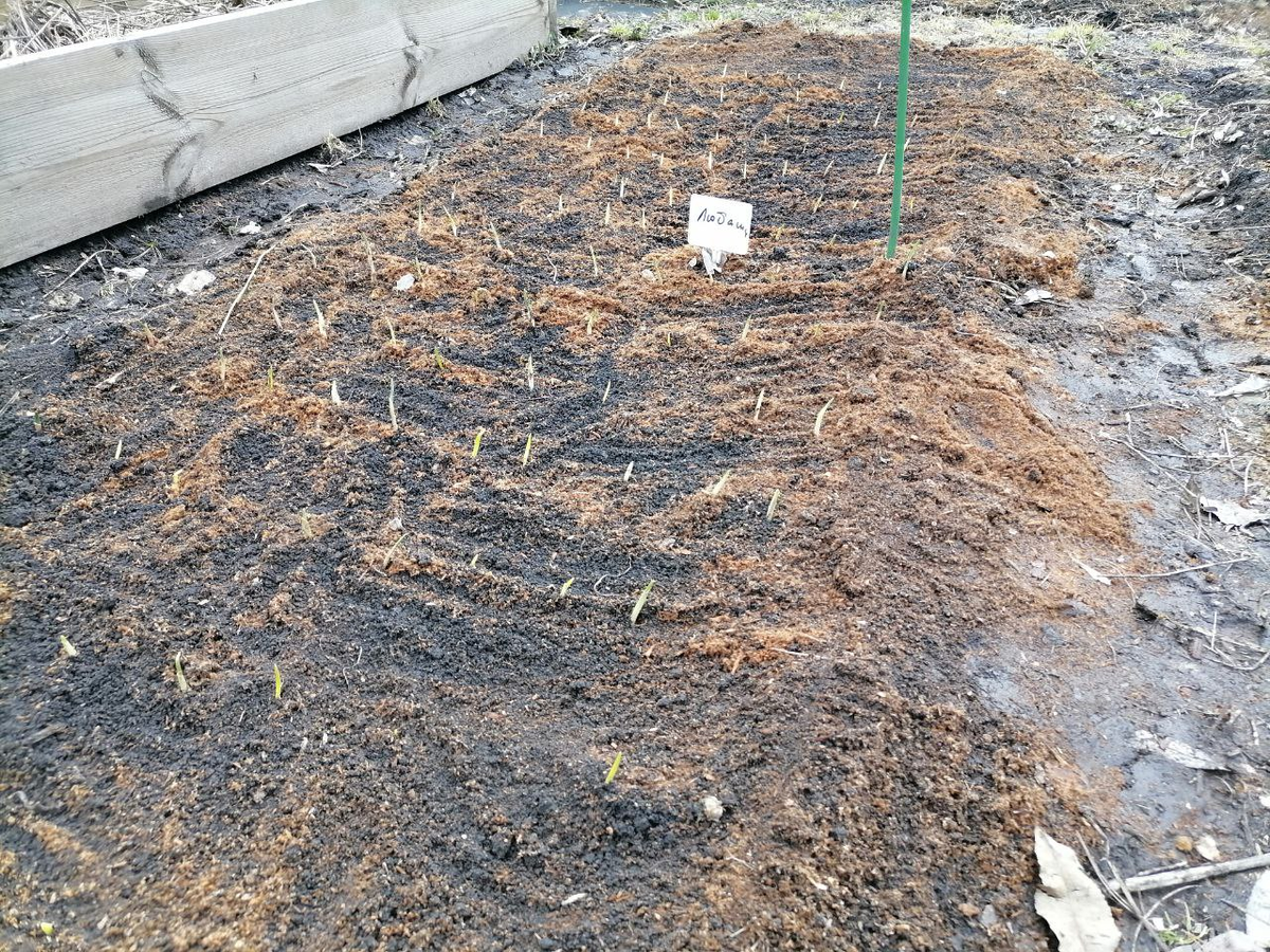 Севок, посаженный под зиму, значительно отстает в росте от чеснока, появляясь только после майских праздников. Однако, благодаря тому, что лук благополучно пережил холод, его перо выглядит свежим и зеленым. На этом участке наблюдаются: