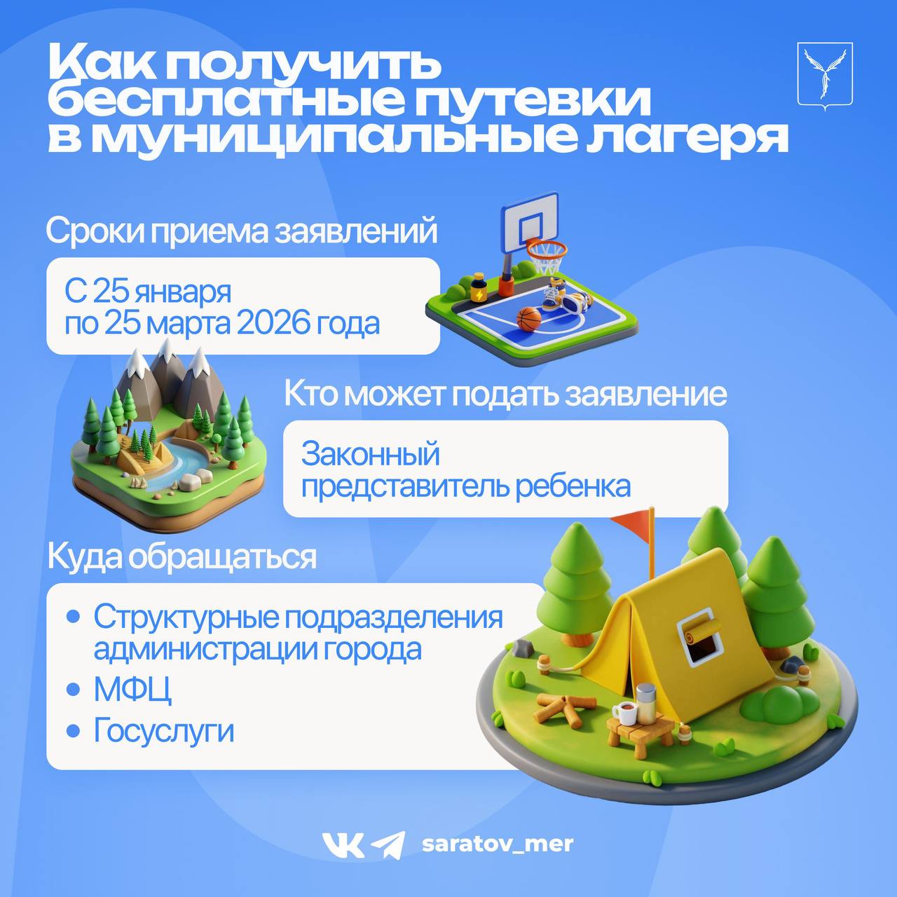 С 25 января стартует прием документов для постановки на очередь детей для получения бесплатной путевки (сертификата) в муниципальный лагерь. Подать заявление и прилагаемые к нему документы можно с 25 января по 25 марта текущего года путем обращения законного представителя ребенка в структурные подразделения администрации муниципального образования «Город Саратов», многофункциональные центры предоставления государственных и муниципальных услуг, Единый портал оказания государственных и муниципальных услуг (Госуслуги).