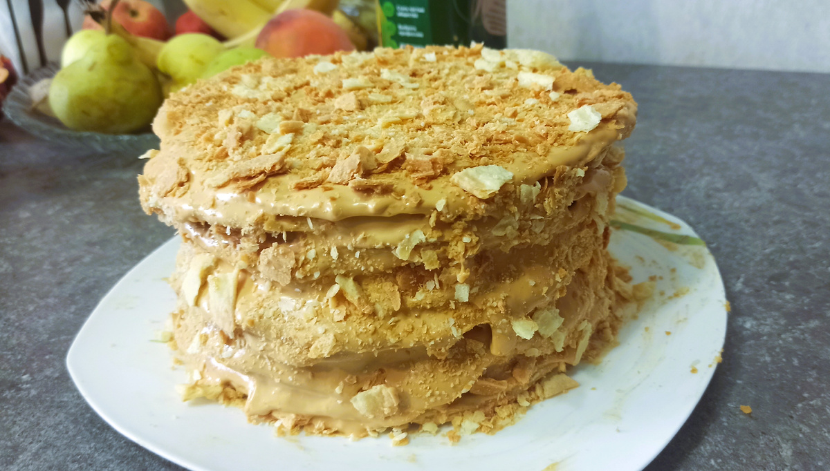 Как только коржи остывают, начинается сборка торта. На каждый корж наносится щедрый слой крема — взбитого сливочного масла с варёной сгущёнкой. Остатки крема распределяются по бокам, а обрезки от теста можно размять и присыпать ими торт сверху для украшения.