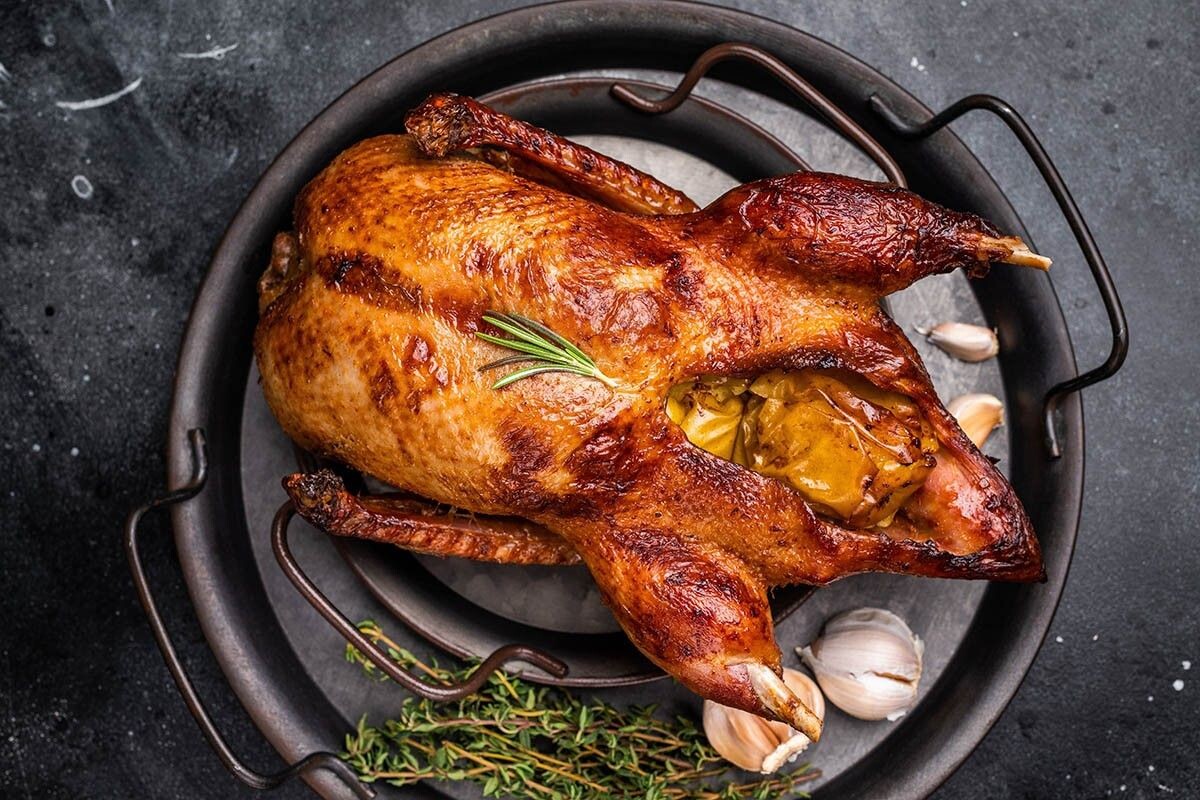 - Запекать гуся при температуре 200°С первые 30 минут, чтобы запечатать соки внутри, затем снизить до 160°С и продолжить готовить в течение 50–60 минут на килограмм веса.