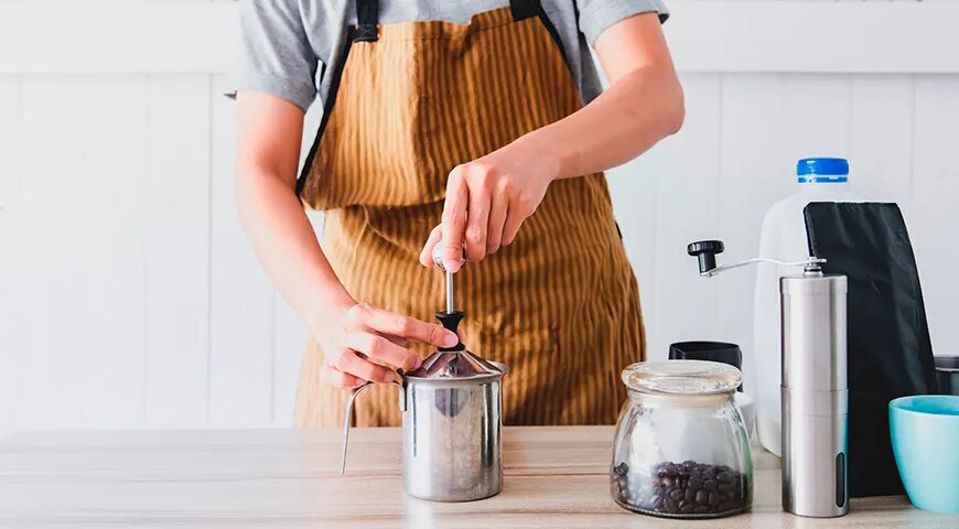1. Френч-пресс. Это наиболее доступный и простой метод. Поршень создает давление, насыщая молоко воздухом. Хотя такая пена не подойдет для латте-арта, для капучино она вполне сгодится.