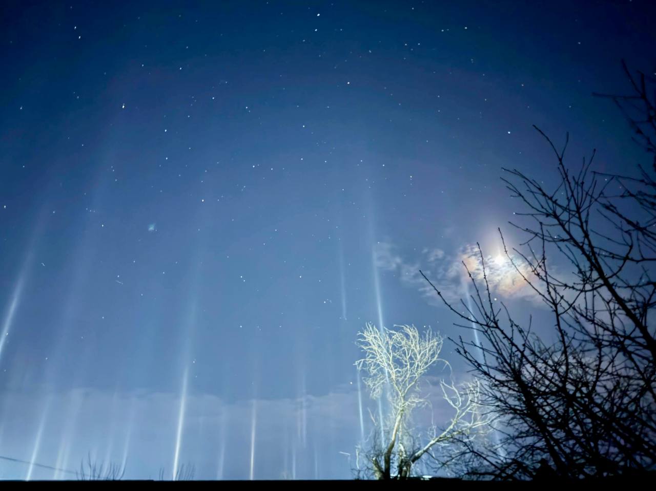 Яркие лучи, словно небесные фонари, уходили в звездное небо. Фотографии этого редкого природного явления опубликовал глава муниципалитета Дмитрий Живайкин. Такое явление обычно происходит в морозную погоду, когда свет отражается от кристаллов льда в атмосфере.