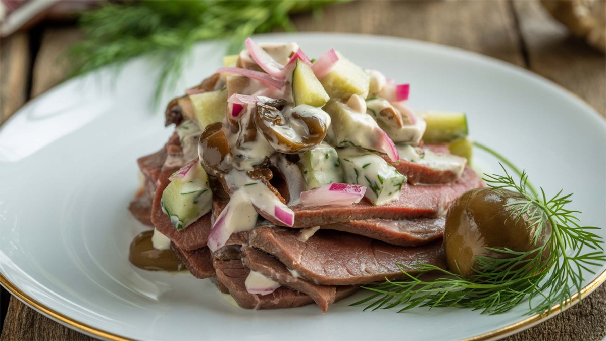 Этот салат славится своим отменным сочетанием: нежный язык, хрустящие маринованные огурцы и ароматные грибы создают настоящую кулинарную симфонию. Простота в приготовлении делает его идеальным вариантом для любого стола.