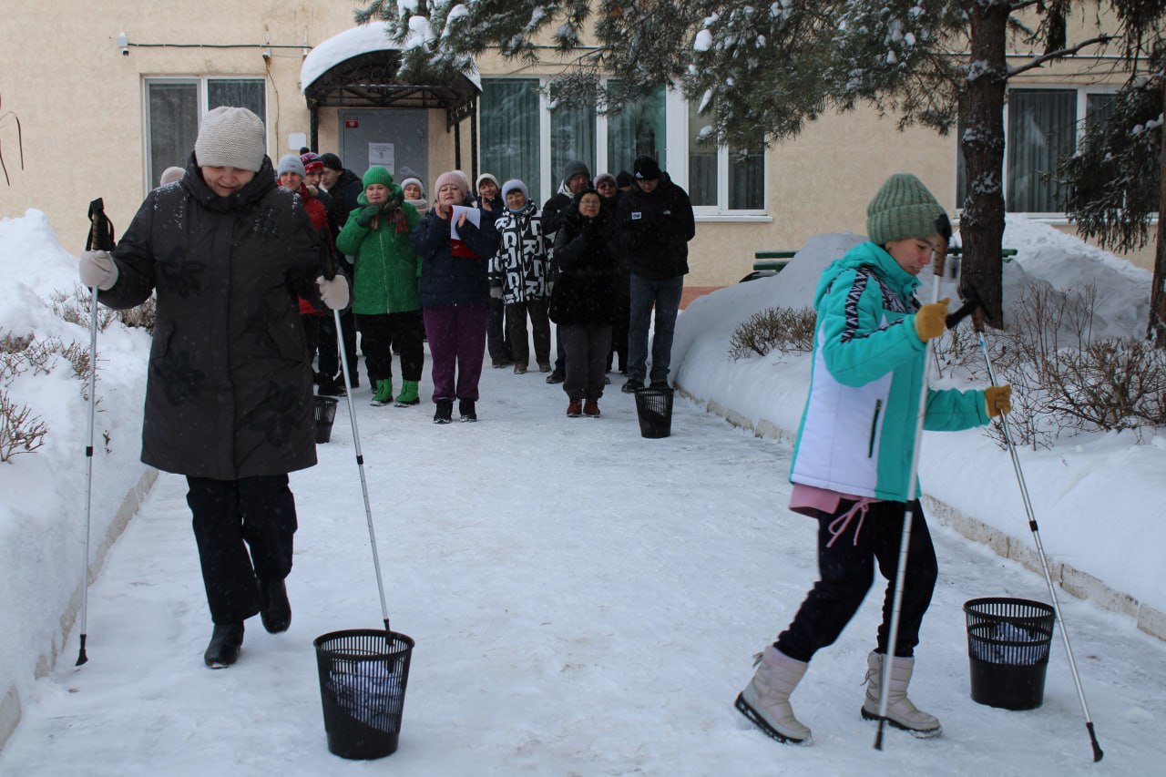 Перед началом соревнований участники разделились на две команды. Эстафета включала в себя несколько этапов: кидание снежков в корзину, ходьба с лыжными палками на скорость, бег «паровозиком».