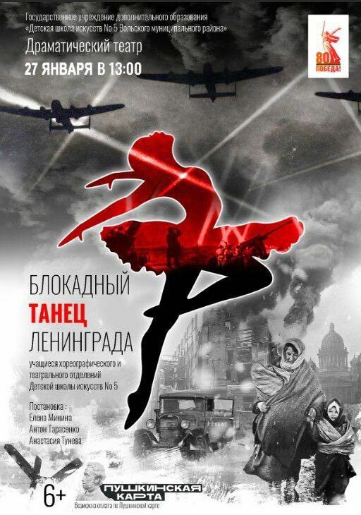 27 января 2026 года, в День воинской славы России, День полного освобождения Ленинграда от немецко-фашистской блокады, на сцене Драматического театра г. Вольска ученики и педагоги ДШИ №5 Вольского района представят спектакль «Блокадный танец Ленинграда».