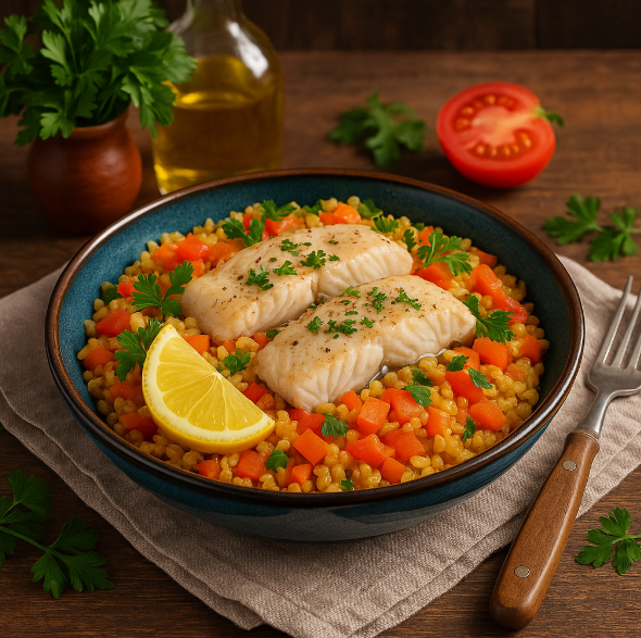 Секрет вкуса — легкое обжаривание овощей и плавное томление вместе с булгуром, чтобы аромат прятался в каждом зерне, а рыба сохраняла нежность и сочность.