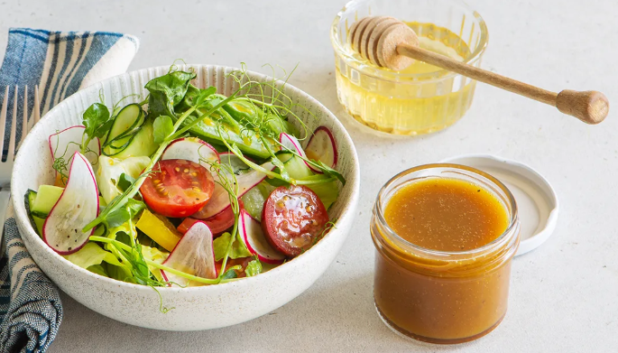 Ингредиенты: 1 ст. ложка дижонской горчицы, 3 ст. ложки оливкового масла extra virgin, 1 ст. ложка винного уксуса, 1/2 ч. ложки соли, 1/4 ч. ложки молотого перца, 1 ч. ложка меда по желанию.