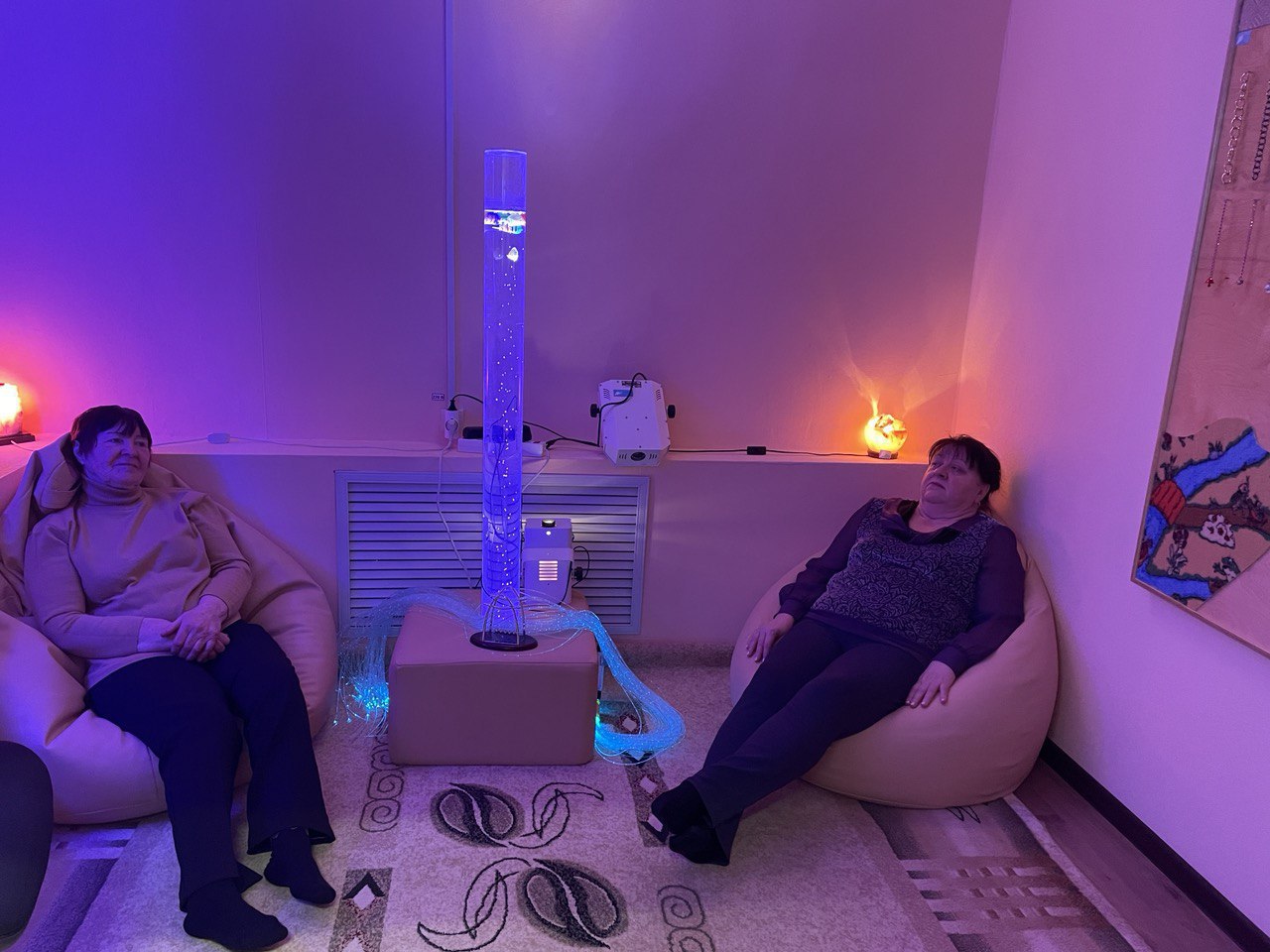 К примеру, пенсионеры, посещающие центр, восстанавливают эмоциональный баланс с помощью тактильных дорожек, песочной терапии и акустических панелей, с использованием специального светового оборудования и в сопровождении расслабляющих звуков природы.