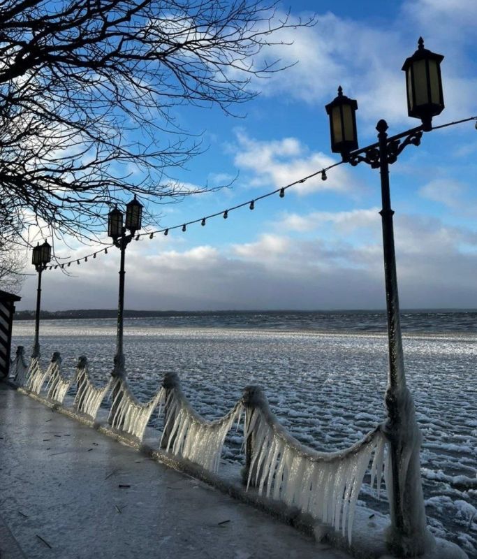 Выходные принесли на озеро поистине завораживающие пейзажи. Метель и пронизывающий мороз укутали набережную ледяным покровом, а вдоль перил нарастили великолепные сосульки, напоминающие сказочные гирлянды.