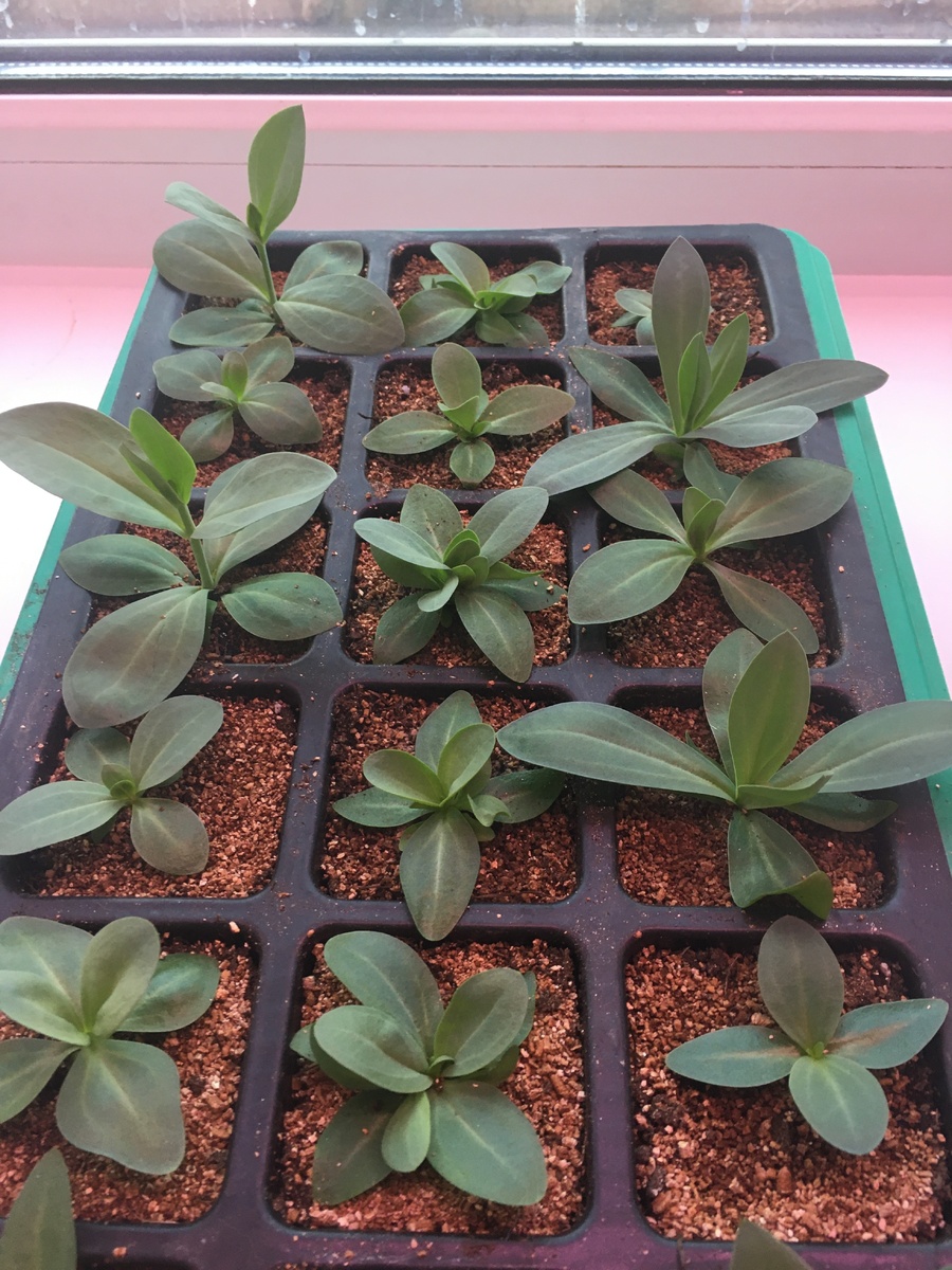 Тем временем, два представителя сорта 'Эхо голубая' от SAKATA, находящиеся в левом ряду, заметно обогнали своих «собратьев» и резко пошли вверх. Причина кроется в том, что у них корневая система была более компактной и абсолютно не пострадала при пересадке. В то же время, третий представитель эустомы, посеянный в лоточке, практически сравнялся со своими соседями из таблеток, так как его корневая система выжила после пикировки.