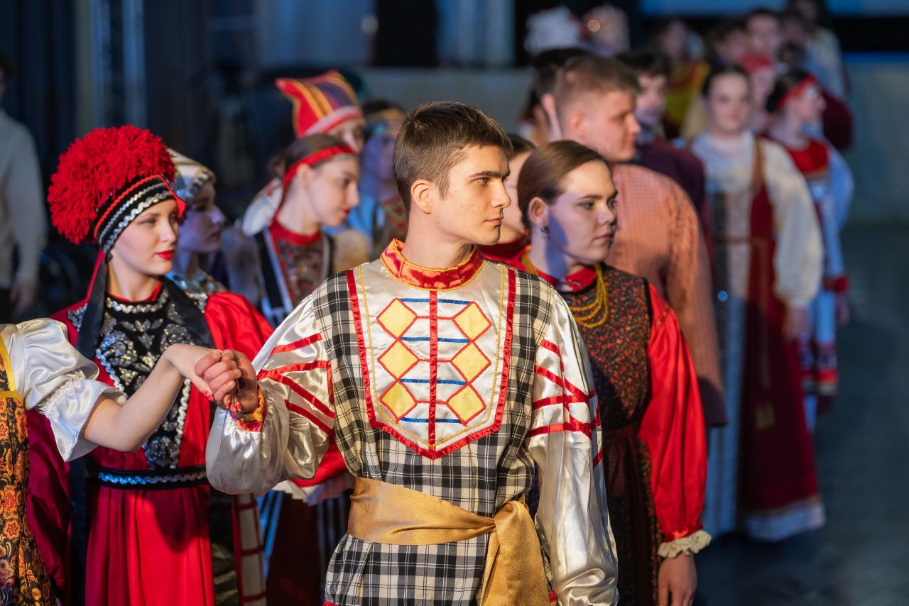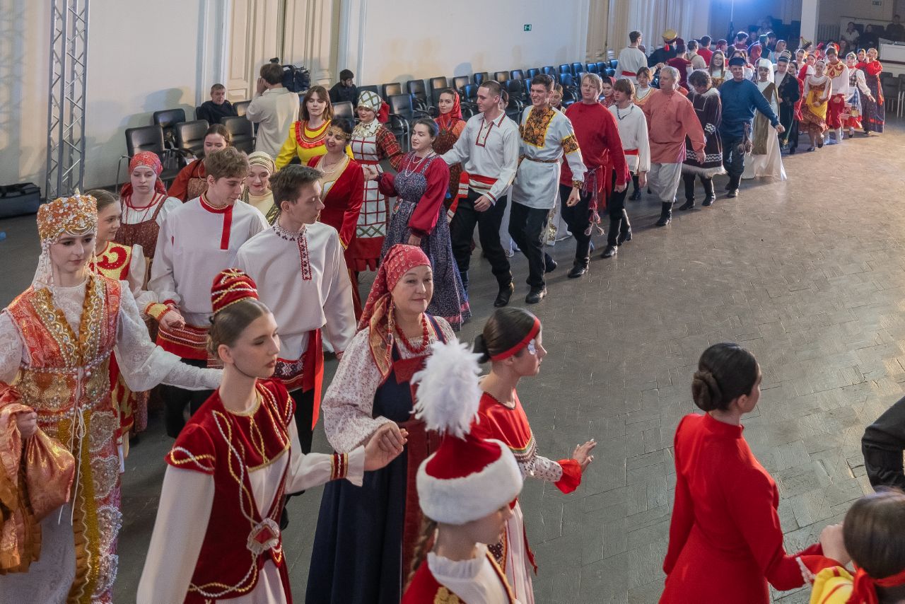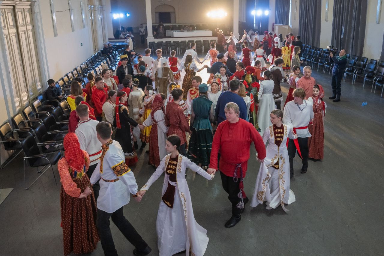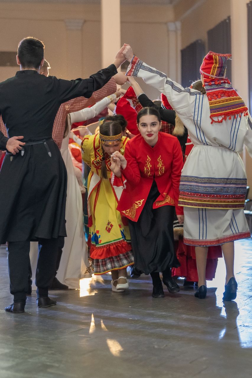 Программа продолжилась танцевально-игровым действом: студенты в национальных костюмах исполнили традиционные танцы, создав завораживающий многоцветный узор. Кульминацией стал общий яркий хоровод всех участников.