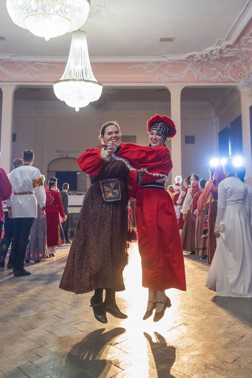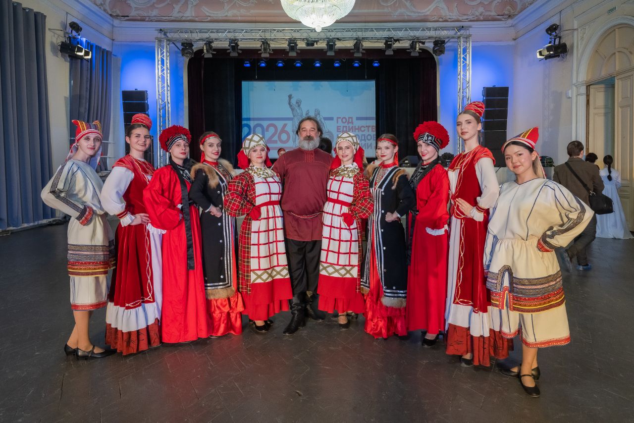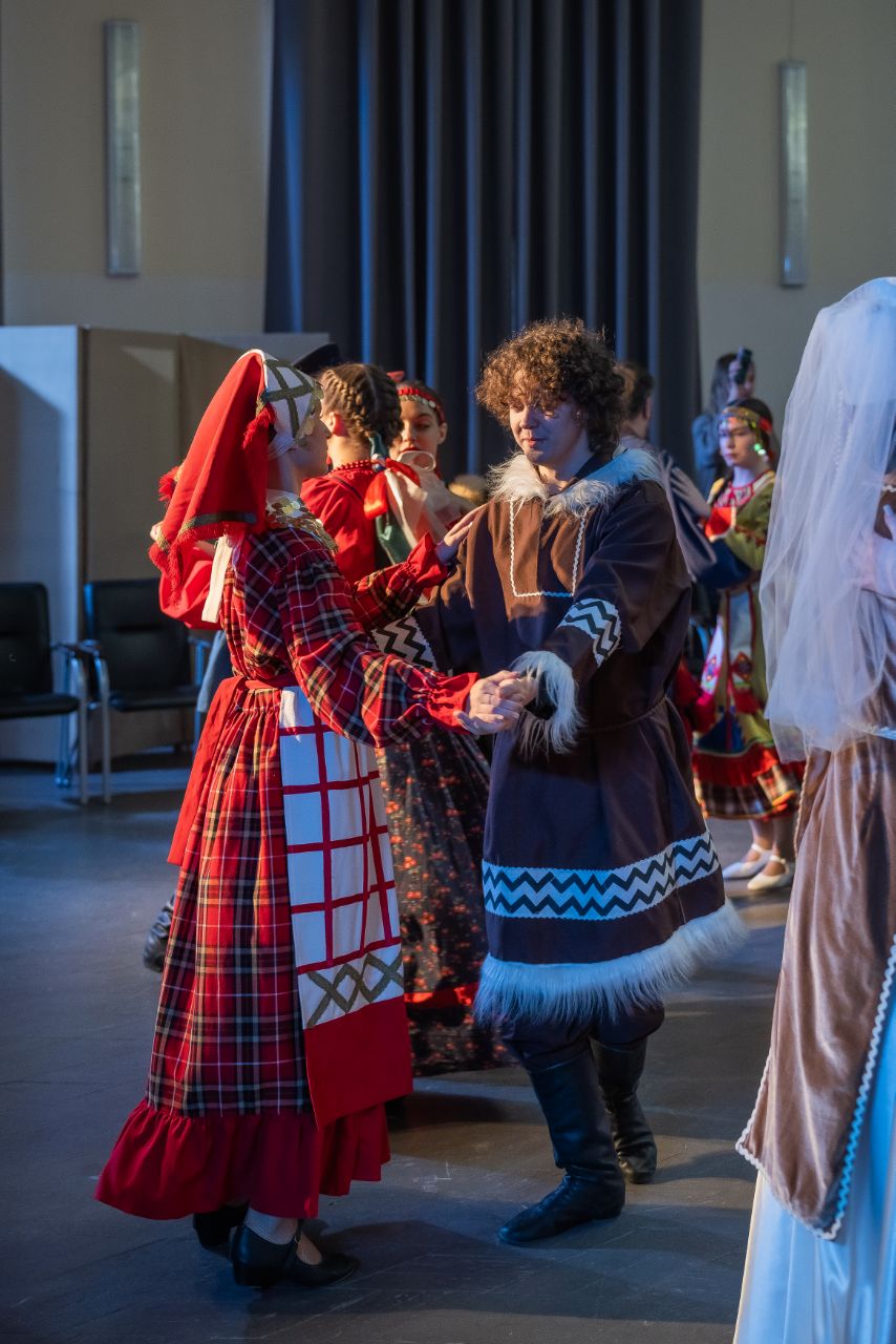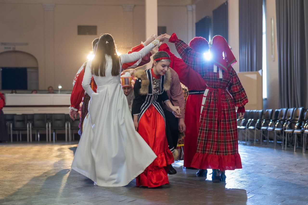 Программа продолжилась танцевально-игровым действом: студенты в национальных костюмах исполнили традиционные танцы, создав завораживающий многоцветный узор. Кульминацией стал общий яркий хоровод всех участников.
