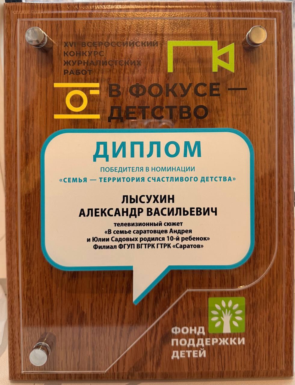 Специальный корреспондент нашей гостелерадиокомпании Александр Лысухин стал лучшим в номинации «Семья – территория счастливого детства» за сюжет «В семье саратовцев Андрея и Юлии Садовых родился десятый ребенок».