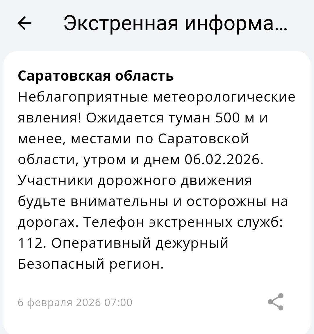 Экстренная информация РСЧС*: Ожидается туман 500 м и менее, местами по Саратовской области, утром и днем 06.02.2026, сказано в уведомлении.