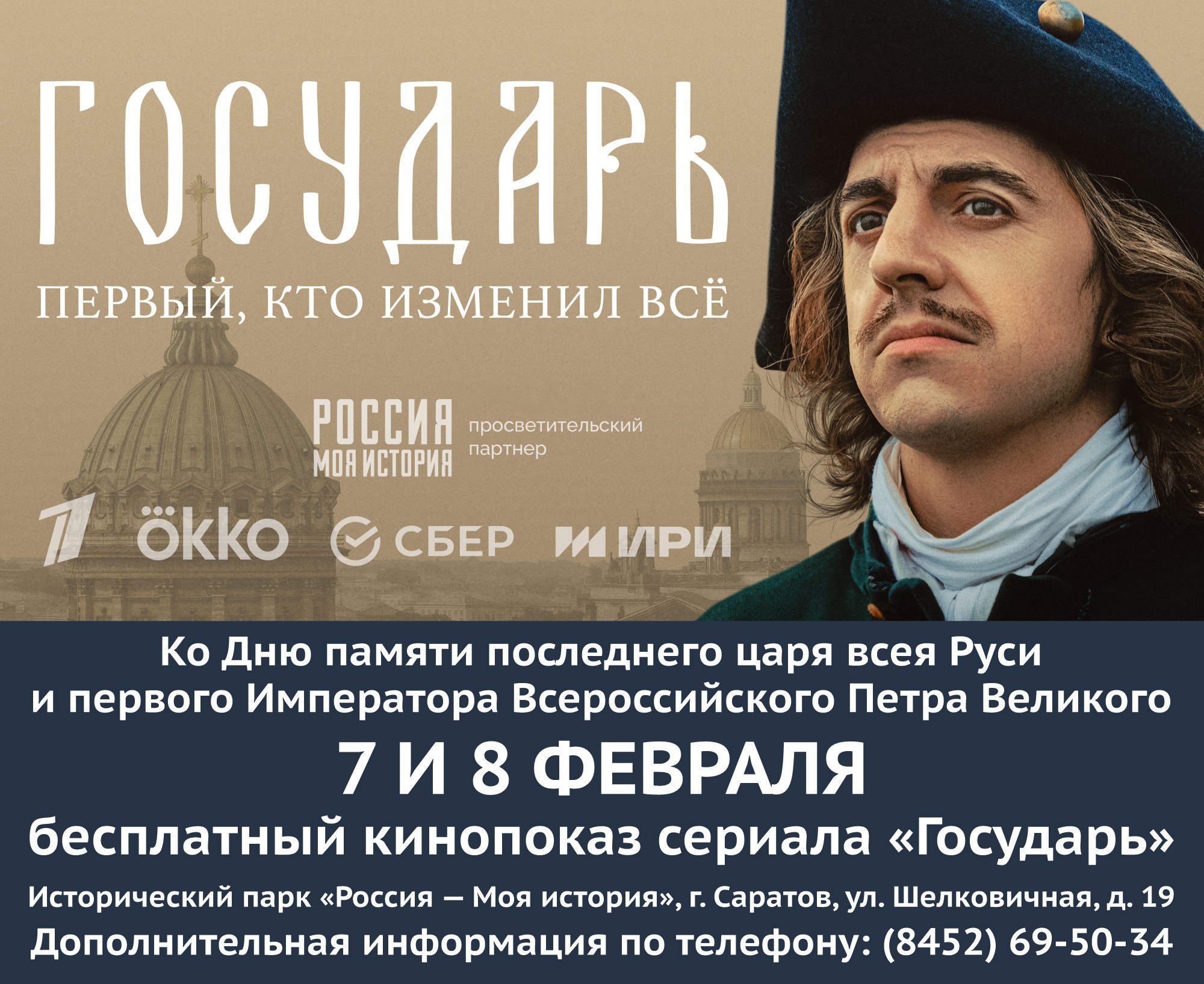 7 и 8 февраля 2026 г. в мультимедийных Исторических парках Россия Моя история по всей стране состоится всероссийский офлайн-показ восьмисерийного художественного фильма Государь. Кинособытие организовано ко Дню памяти последнего царя всея Руси и первого Императора Всероссийского Петра Великого. Проект Россия Моя история стал просветительским партнером исторического сериала.