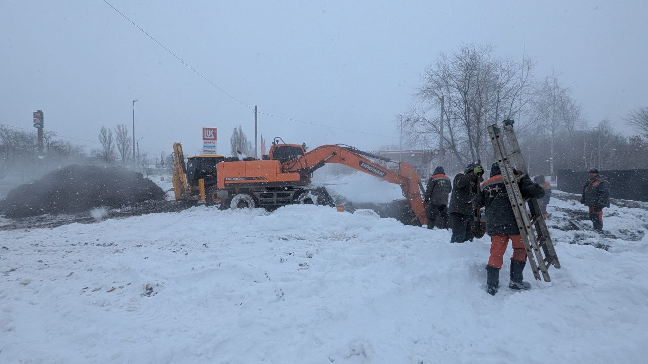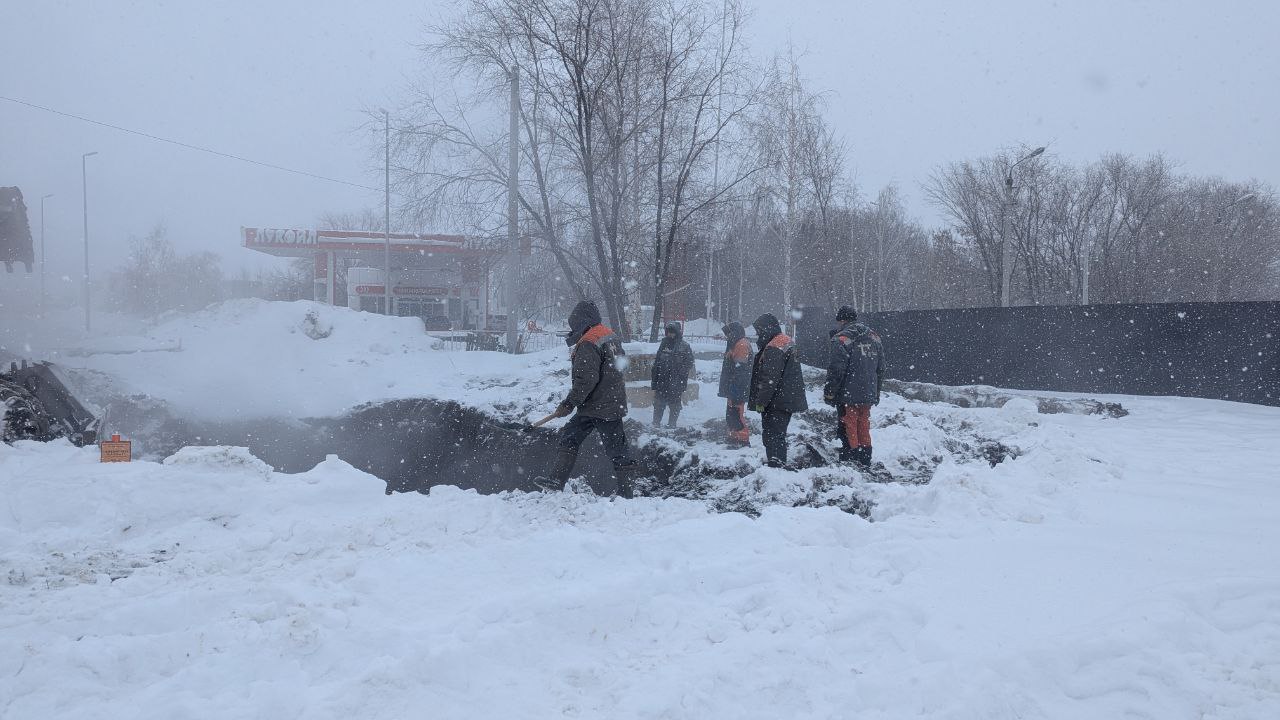 На противоположной стороне от дома № 1 по улице Вокзальной работает бригада специалистов, которые устраняют повреждение на трубопроводе. Из-за выявленного дефекта в некоторых частях города снизилось давление в системе теплоснабжения. Рабочие оперативно отключили дефектный участок и перераспределили нагрузку на другую теплосеть.