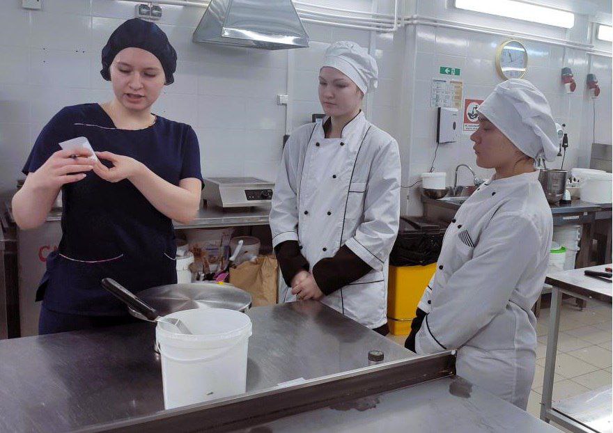Студентам показали рабочие места для приемки и подготовки сырья, полный цикл технологических процессов приготовления различных кондитерских полуфабрикатов, этапы сборки и оформления тортов и пирожных, а также заключительные операции подготовки готовой продукции к реализации.