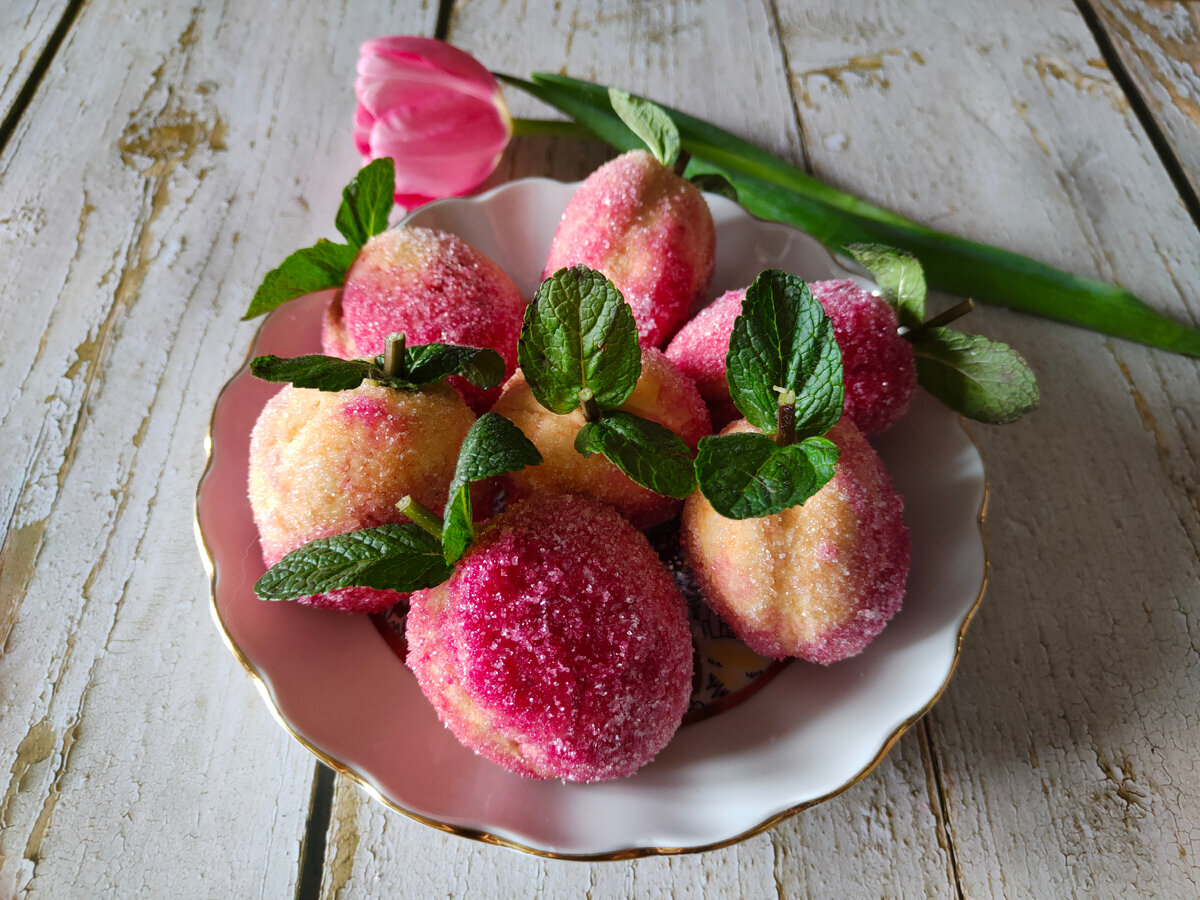 Готовые пирожные обмакиваются в морковный и свекольный сок, а затем обсыпаются сахаром. Таким образом, каждая вариация пирожного «персик» становится не только эстетически привлекательной, но и невероятно вкусной.