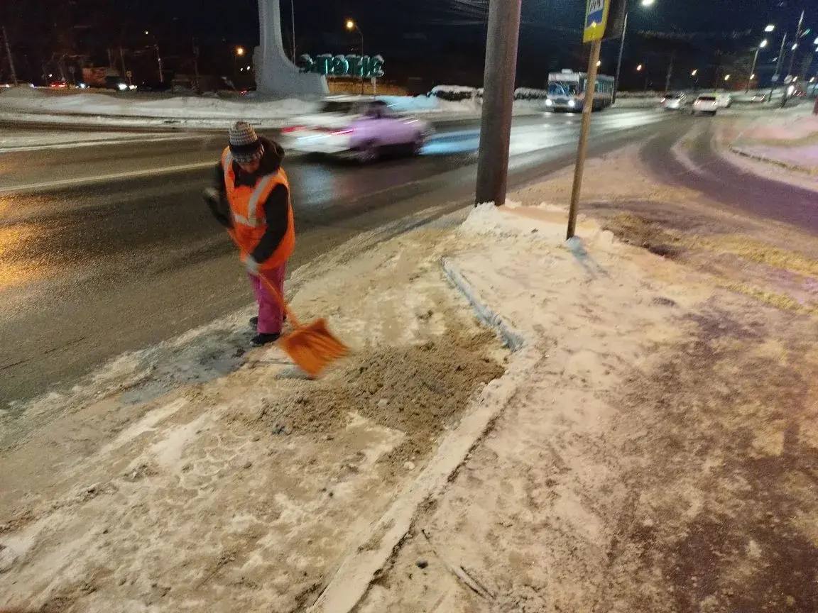 В течение дня техника и рабочие бригады продолжат работу по уборке улиц, обработке тротуаров противогололедными материалами.