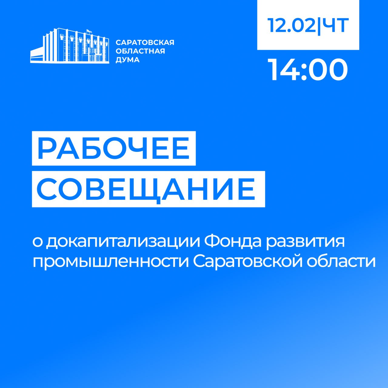 12 февраля в Саратовской областной Думе планируется рабочее совещание по вопросу «О докапитализации Фонда развития промышленности Саратовской области»