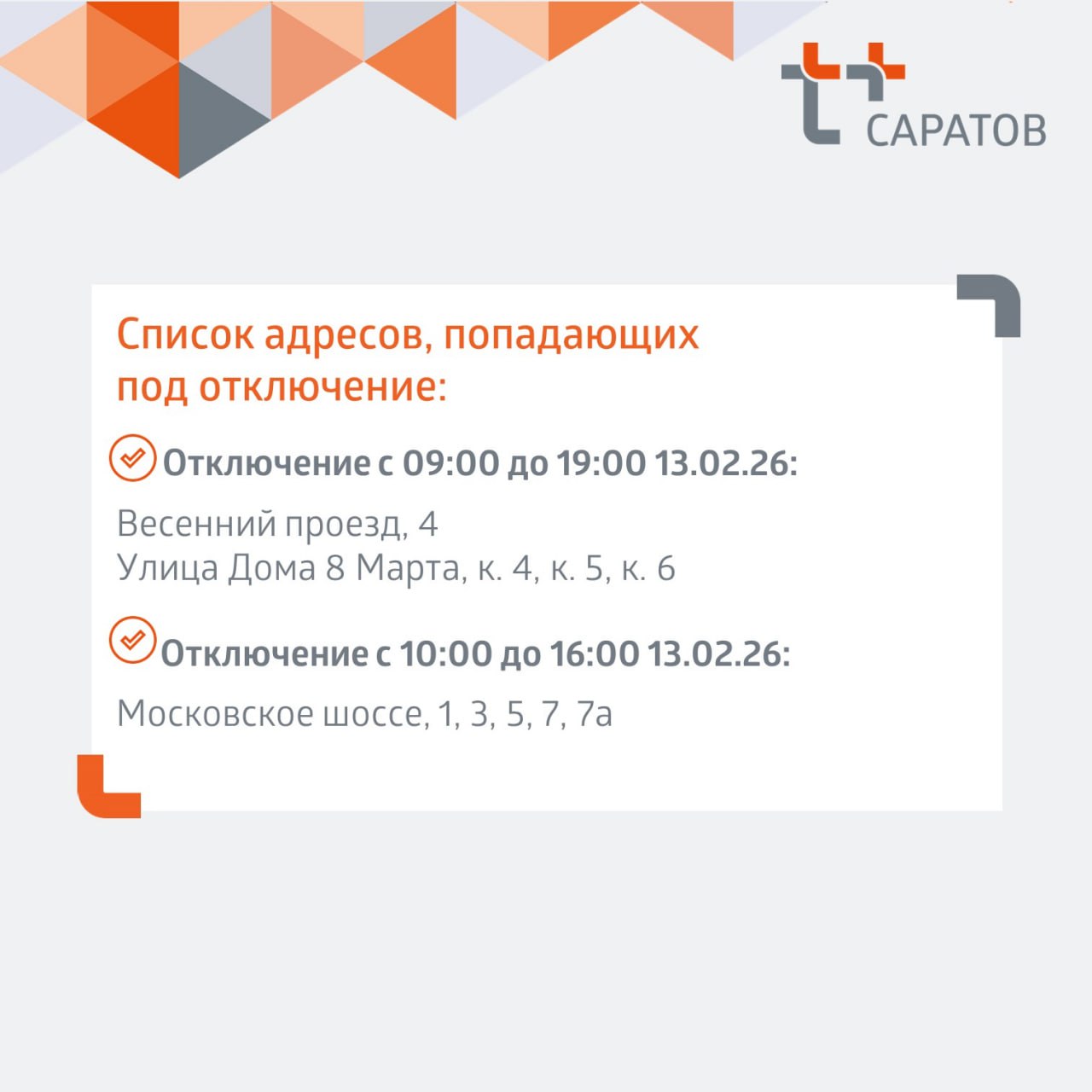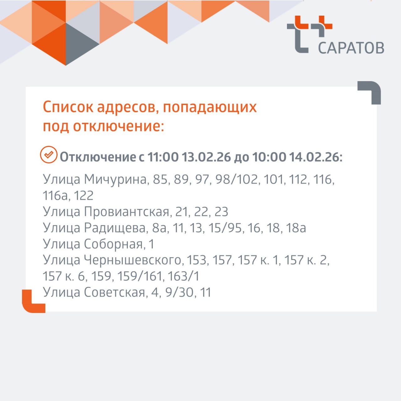 Адреса отключений и планируемое время завершения работ - в карточках