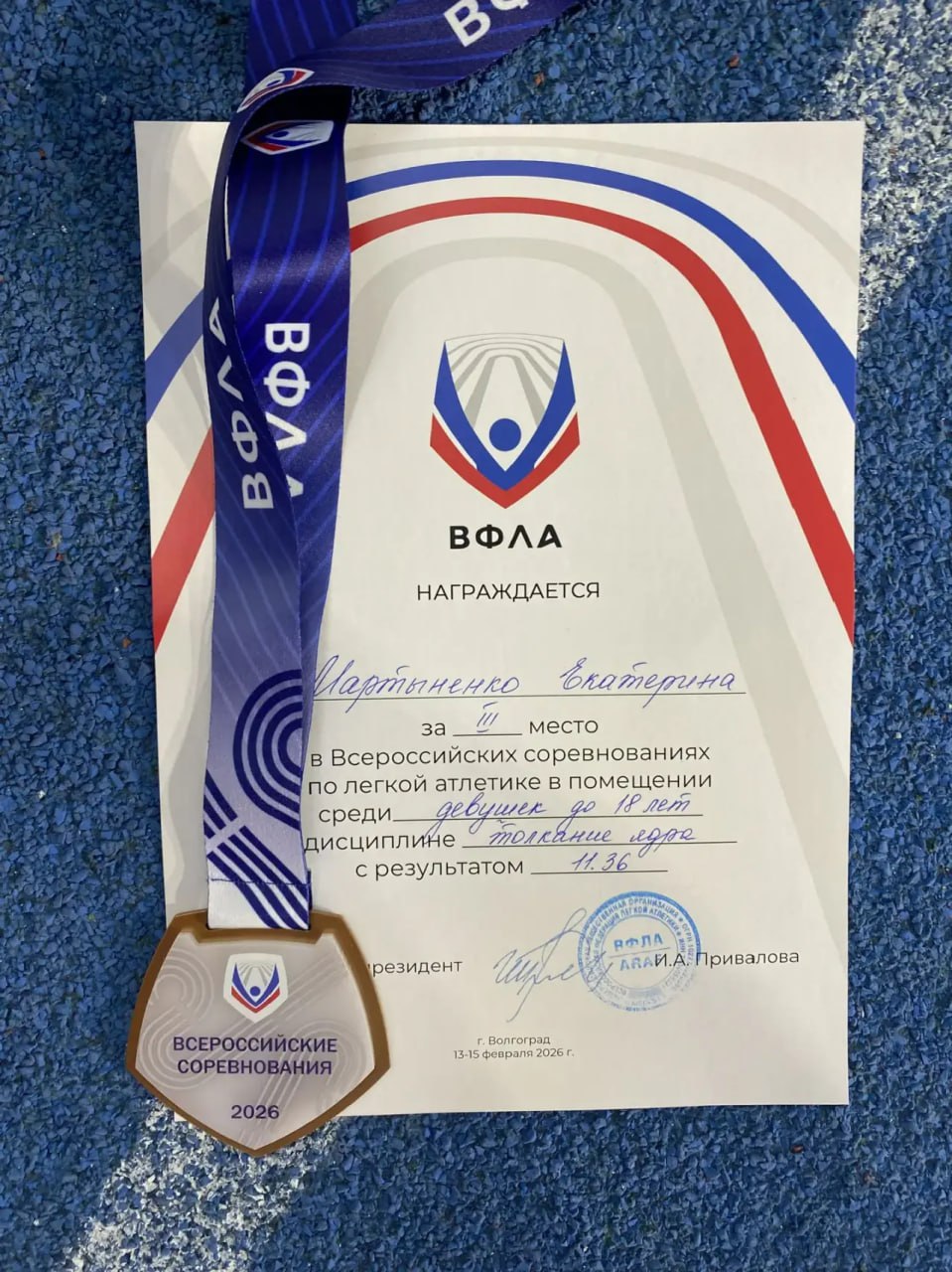Мартыненко Екатерина заняла 3 место в толкании ядра среди девушек до 18 лет.