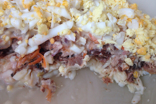 Теперь можно приступить к сборке салата. Начните с тертых белков, полейте их соусом, затем добавьте слой сыра, снова соус, тунца, еще немного соуса, затем натертую морковь с нарезанным луком. Закончите слоем тертых желтков. Каждый слой будет вкусным и аппетитным благодаря гармоничному сочетанию всех ингредиентов.