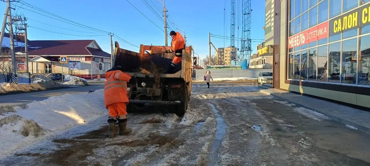 Сотрудники «Комбината благоустройства» продолжают убирать снег и обрабатывать улицы от гололеда. Они используют пескосоляную смесь для обработки дорог и тротуаров, что помогает не только предотвратить скольжение, но и растопить ледяные корки на асфальте. Особое внимание при этом уделяется автобусным остановкам, пешеходным переходам и социальным объектам.