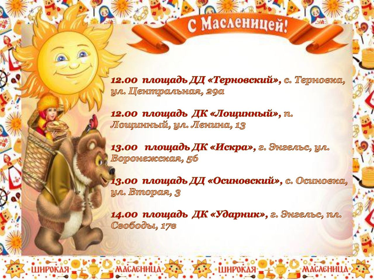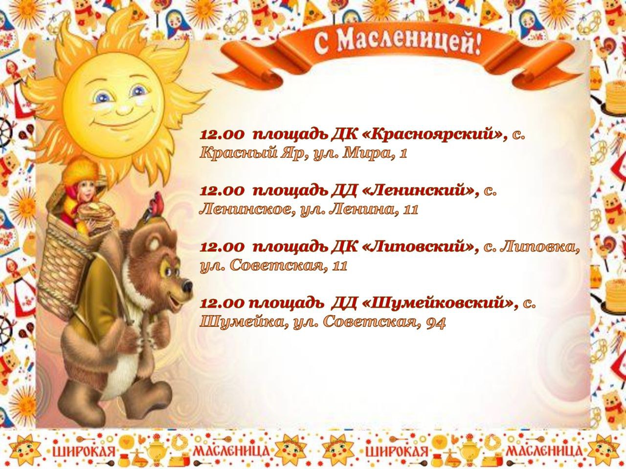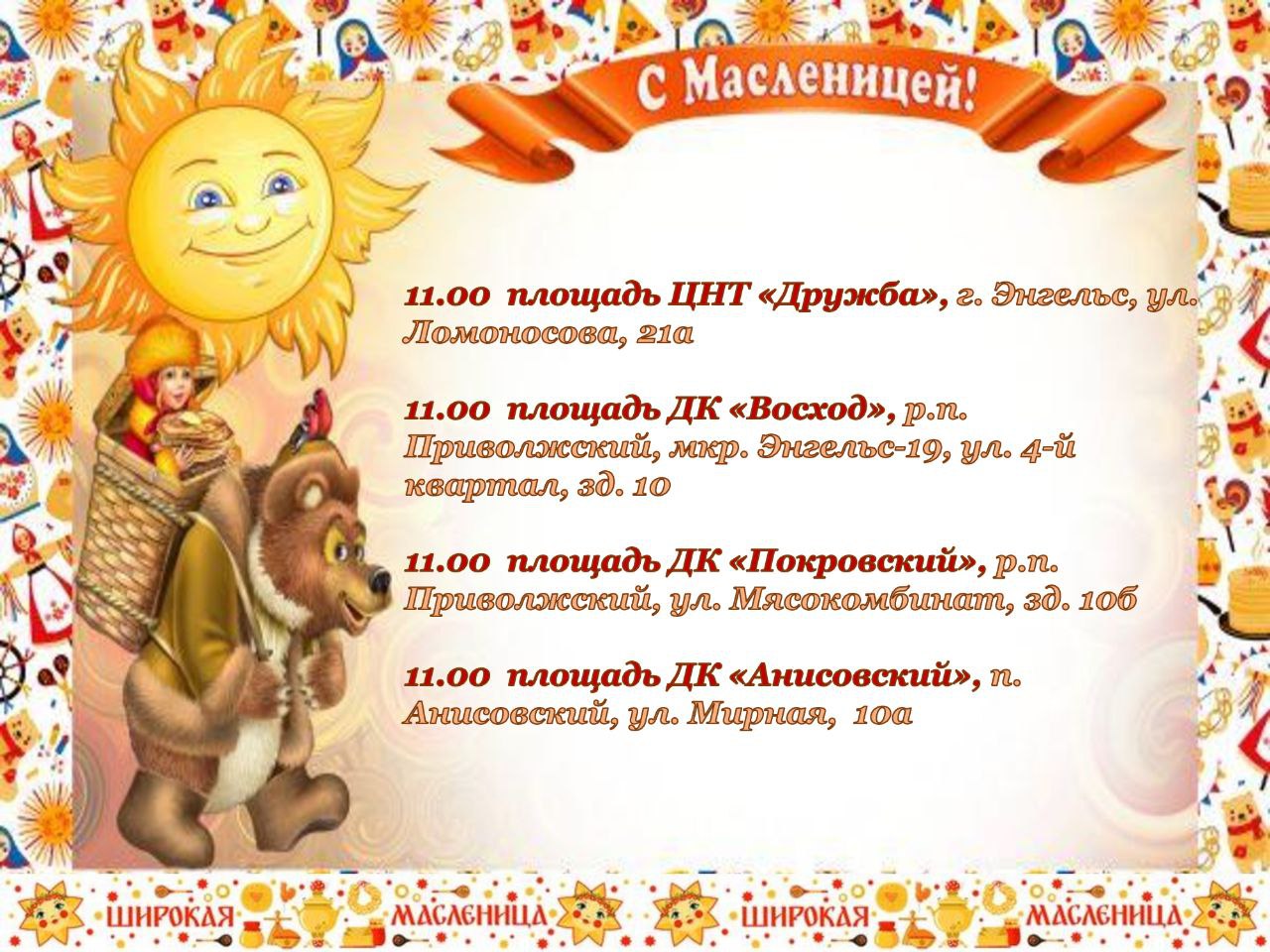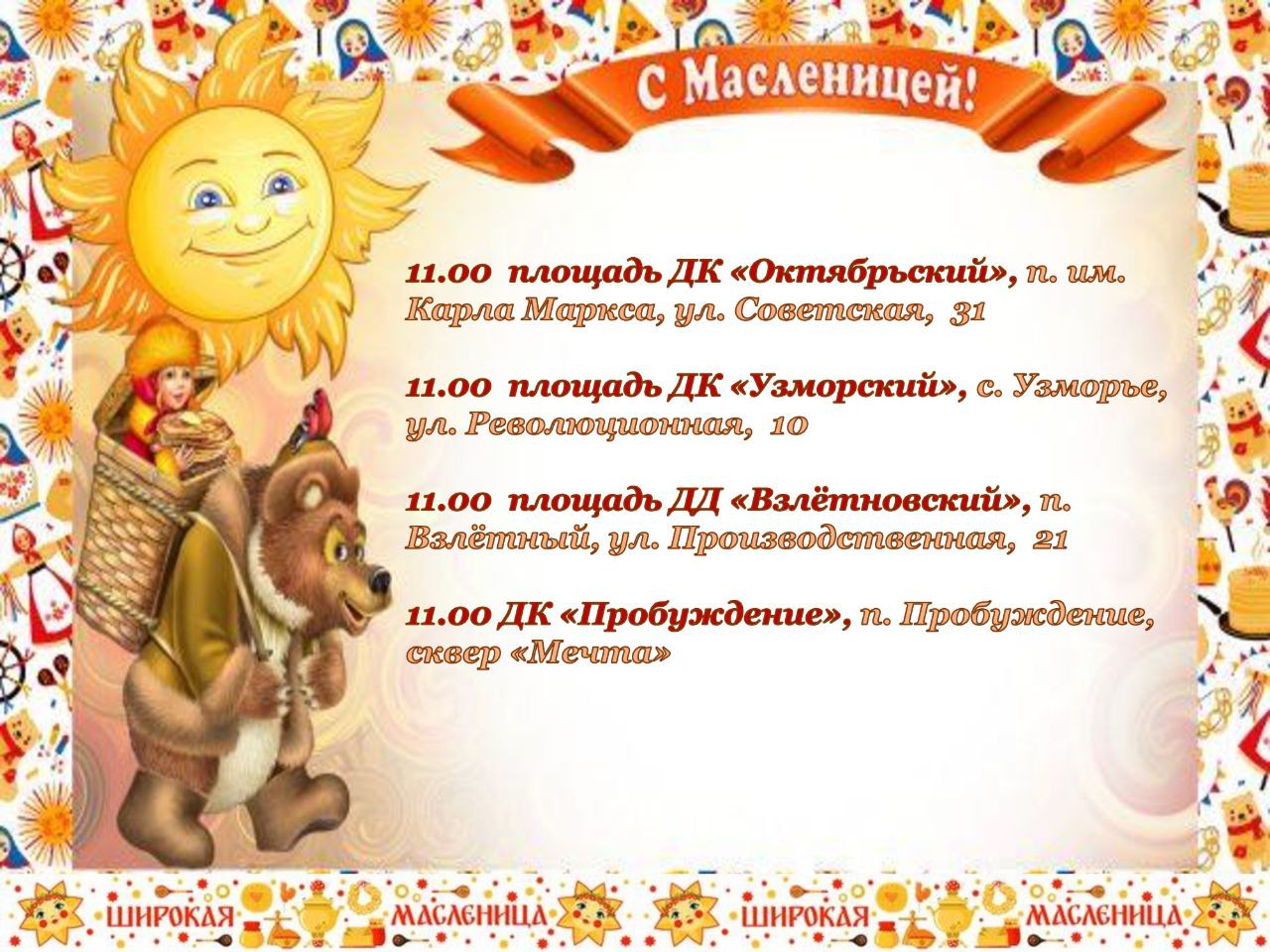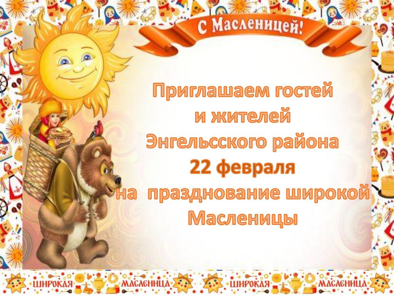 22 февраля приглашаем вас на массовые уличные мероприятия, посвящённые празднованию Широкой Масленицы!
