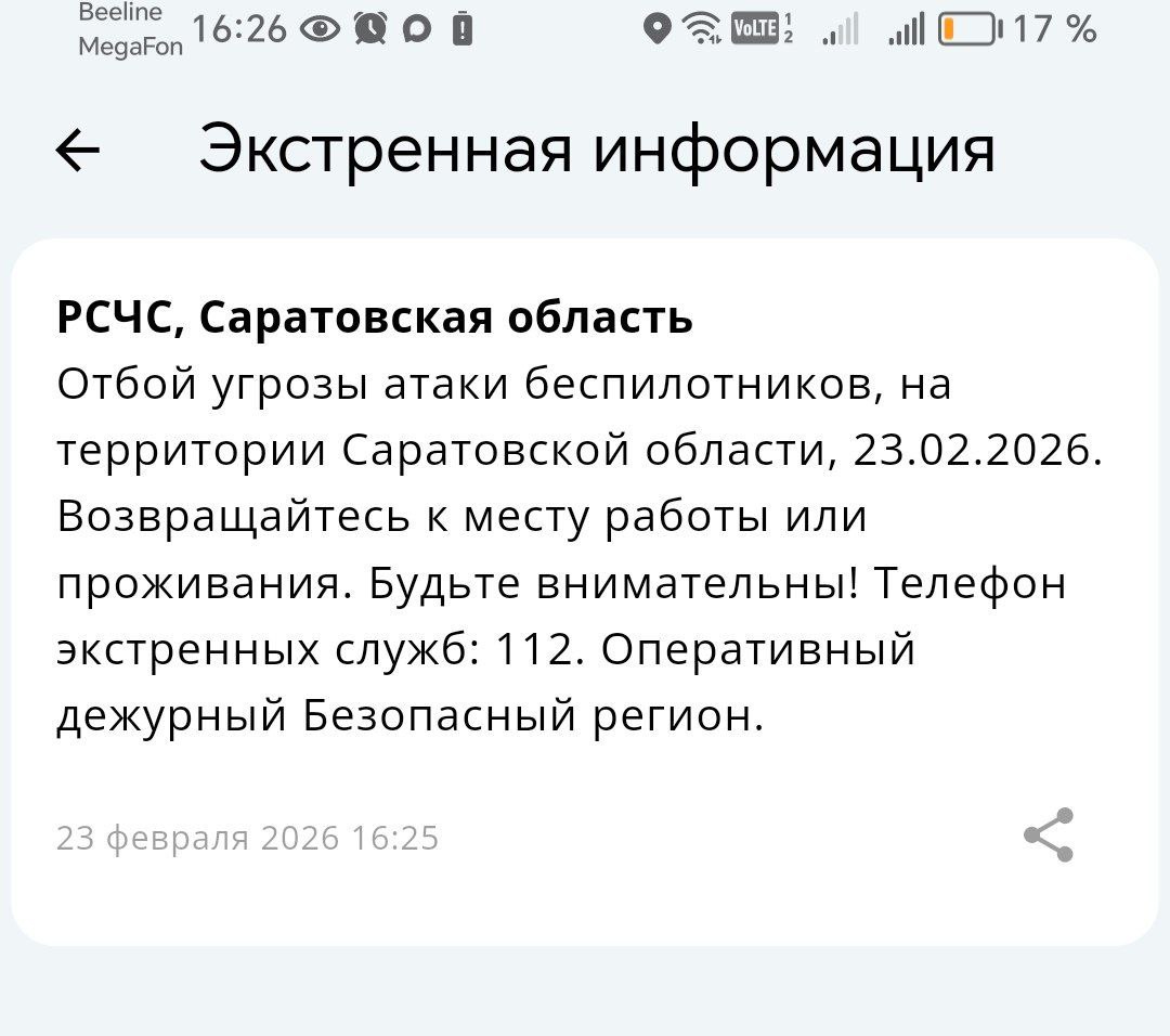 Информация поступила от министерства обороны.Локально в местах возможной угрозы работают системы оповещения. Все экстренные службы приведены в полную готовность, — сообщил губернатор Саратовской области.Мы в MAX | Мы в TG |...