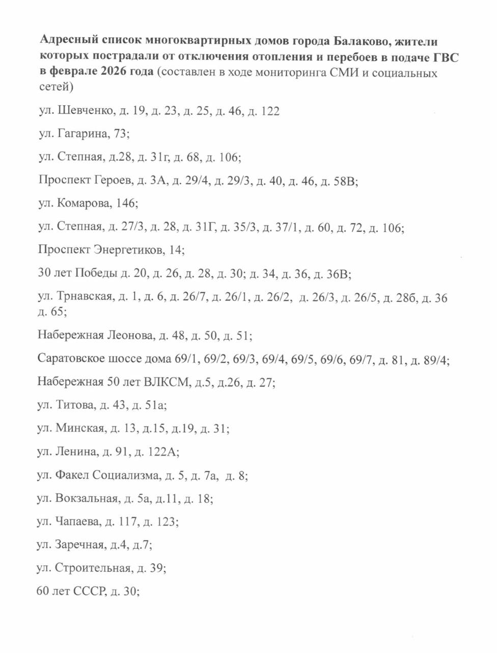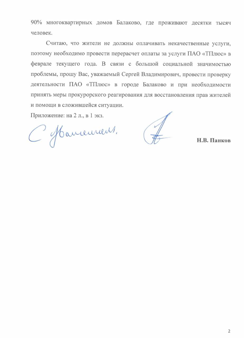 «Как и обещал, направил адресный список в прокуратуру с просьбой провести проверку деятельности ПАО «ТПлюс» и помочь восстановить права граждан. Считаю, жители не должны платить за некачественные услуги»,