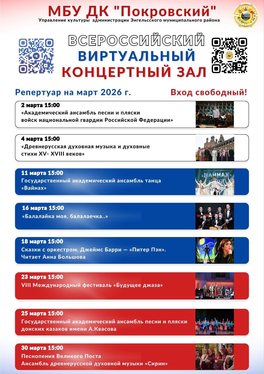 Афиша виртуального концертного зала на март 2026 года.