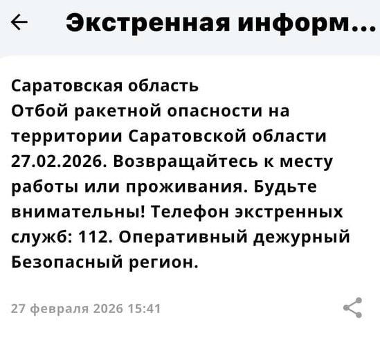 Аэропорт открытНа территории Саратовской области сняли угрозу ракетной опасности, которую объявляли около двух часов назад. Об этом сообщает начальник управления региональной безопасности правительства Юрий Юрин в своих социальных сетях.На...