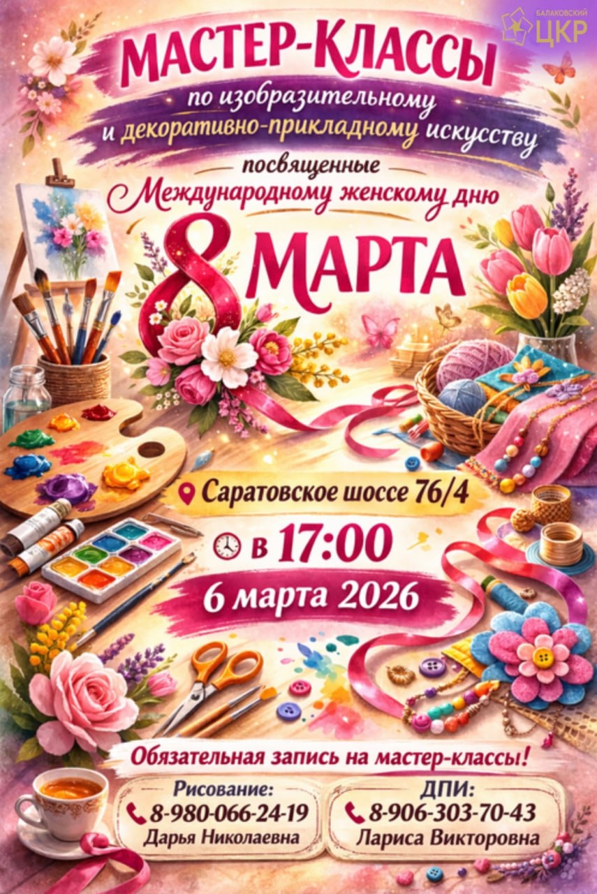 Балаковский ЦКР приглашает на творческие мастер-классы по изобразительному и декоративно-прикладному искусству, посвящённые Международному женскому дню