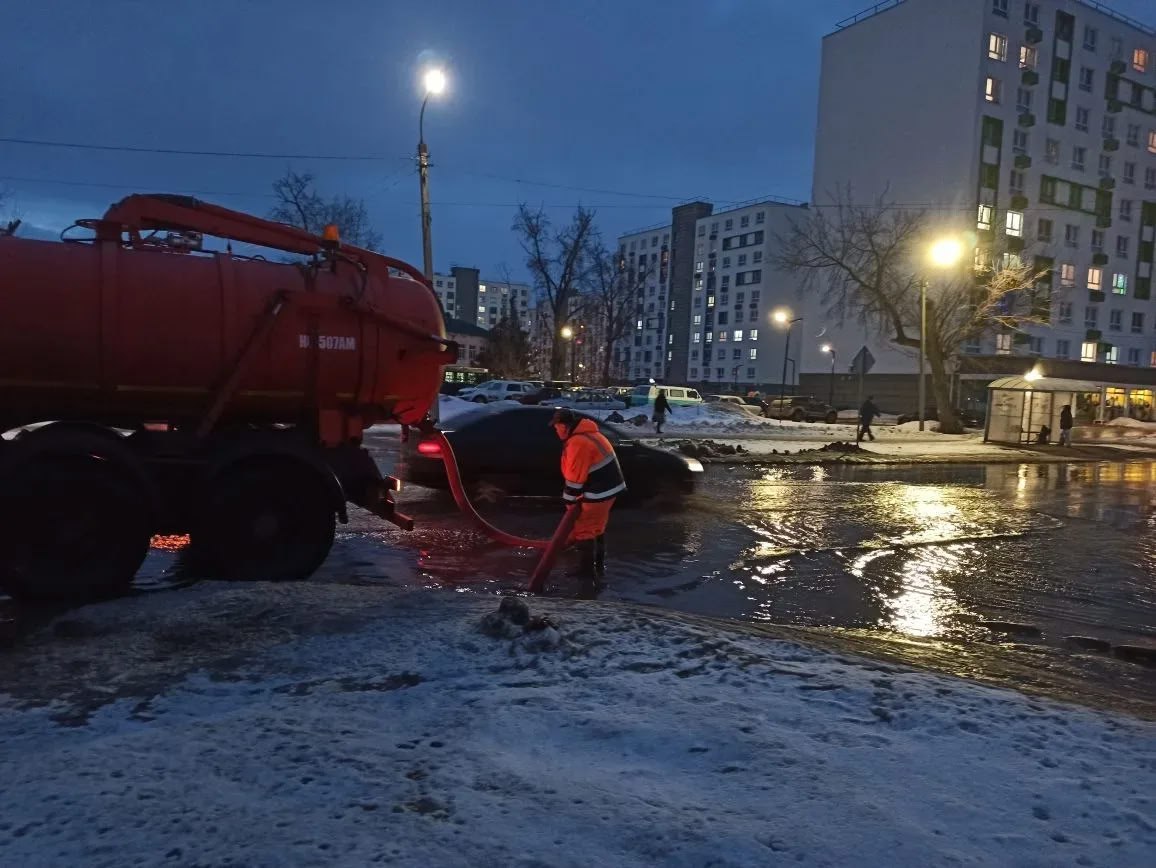 Откачка талых вод производилась на улицах Волжской, Щорса, Минской и Комсомольской. Коммунальные службы также отрабатывают заявки от жителей. Днем работы по откачке талых вод и очистке дождеприемников продолжатся.