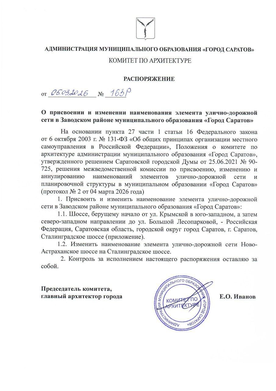 Участку дороги на выезде из Саратова в сторону Волгограда официально присвоено название «Сталинградское шоссе». Новое название получил участок дороги от улицы Крымской до улицы Большой Лесопарковой.