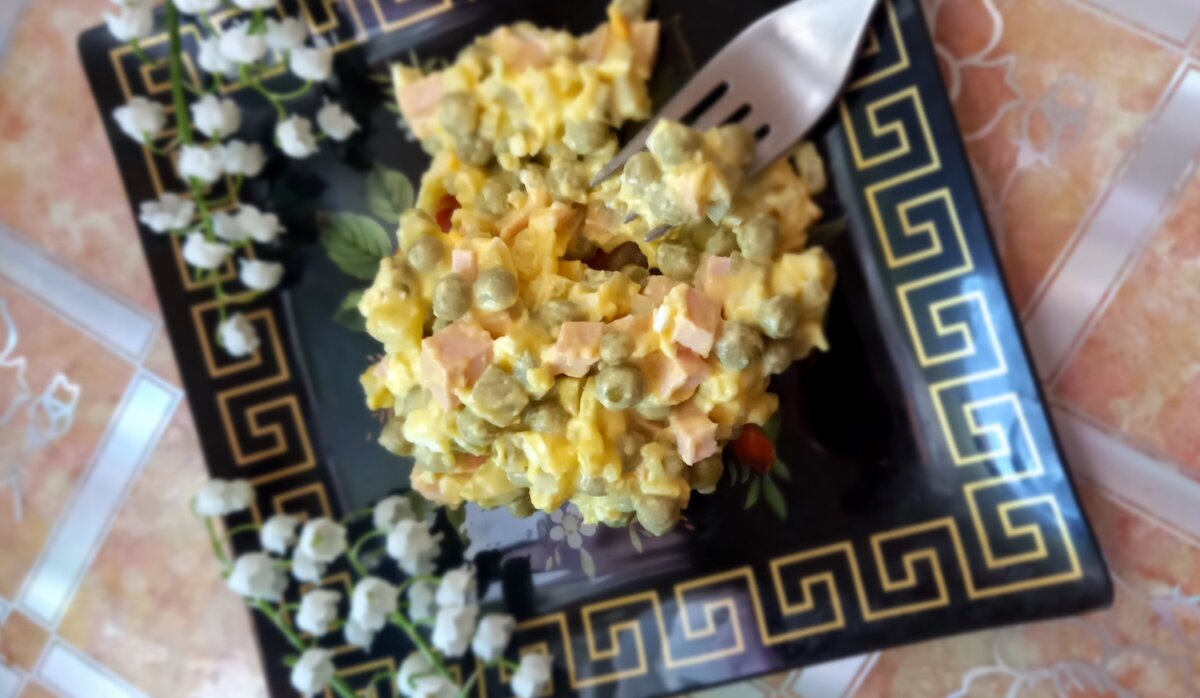 Огурцы также подготовлены: их консервируют кружочками, а для салата нарезают кубиками, добавляя по вкусу. После этого в общую массу добавляется горошек и всё тщательно перемешивается, где последним аккордом выступает майонез — при необходимости можно добавить немного соли.
