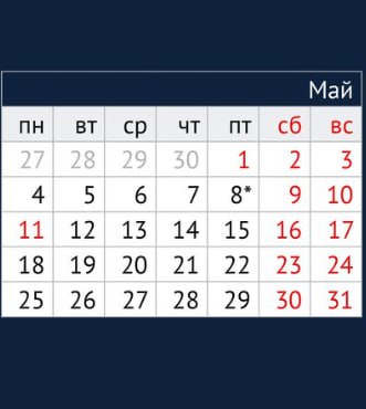 Следующие длинные выходные - в мае. При пятидневном режиме работы отдыхать будем два раза по три дня: с 1 по 3 мая в связи с празднованием Дня Весны и Труда, а также с 9 по 11 мая в связи с празднованием Дня Победы.