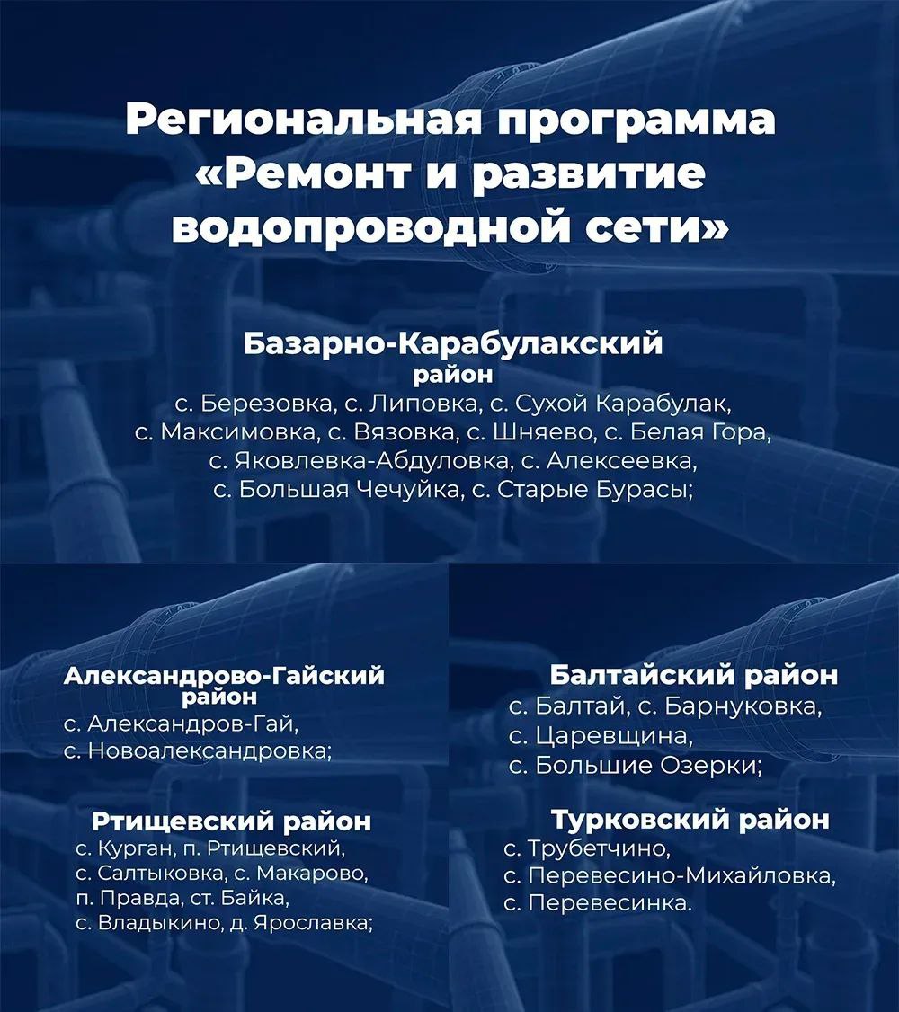 Балтайском районе: село Балтай, село Барнуковка, село Царевщина, село Большие Озерки.
