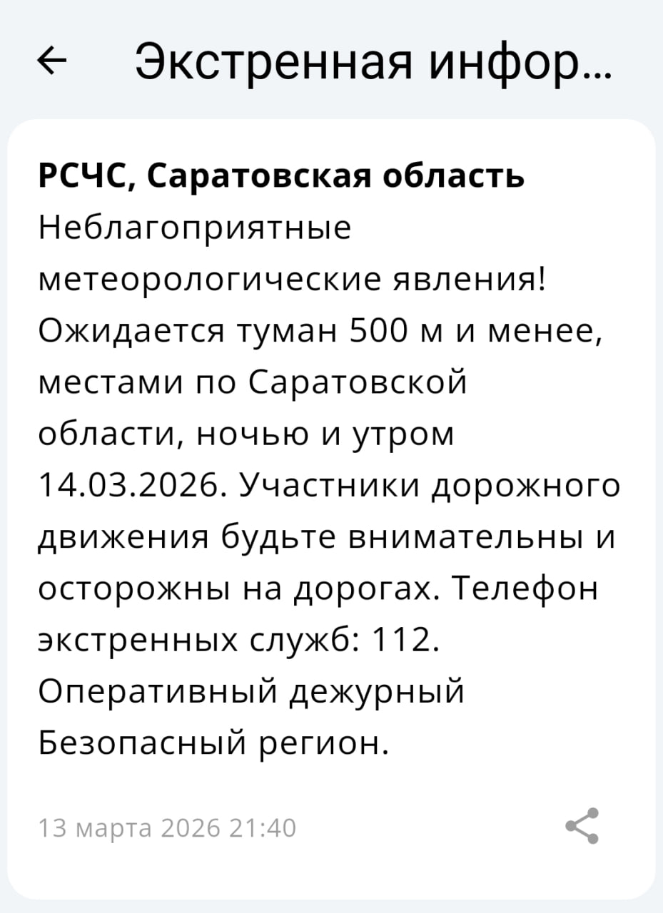 14.03.2026 года ночью:переменная облачность. Без осадков. Местами туман (500 м и менее), изморозь (менее 19 мм). Ветер юго-западный, южный 1-6 м/с. Температура -2...-7°, в пониженных местах до -12°.Днем: переменная облачность. Без осадков. Утром...