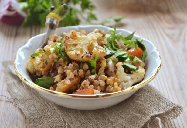 В глубокой миске соединяются запеченные овощи, гречка, нарезанный лук, грецкие орехи и петрушка. Все ингредиенты нужно перемешать с оливковым маслом, лимонным соком, а также приправить по вкусу солью и перцем. Неповторимый вкус гарантирован!