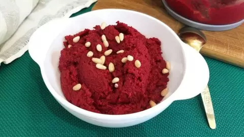 Что касается свеклы, её можно сварить, запечь или приготовить на пару. Нарезанные кусочки свеклы отправляются в измельчитель вместе с вареным нутом, зубчиком чеснока и специями: зирой, сладкой паприкой. Также добавляют яблочный уксус или сок лимона, растительное масло и кунжутную пасту Тахини.