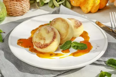 Шаг 4: В отдельной миске легко смешать пюре маракуйи и пюре манго. Подавайте сырники горячими, украшая их фруктовым пюре. Как альтернативу, можно жарить сырники до готовности на сковороде, продолжая готовить еще 5-7 минут.
