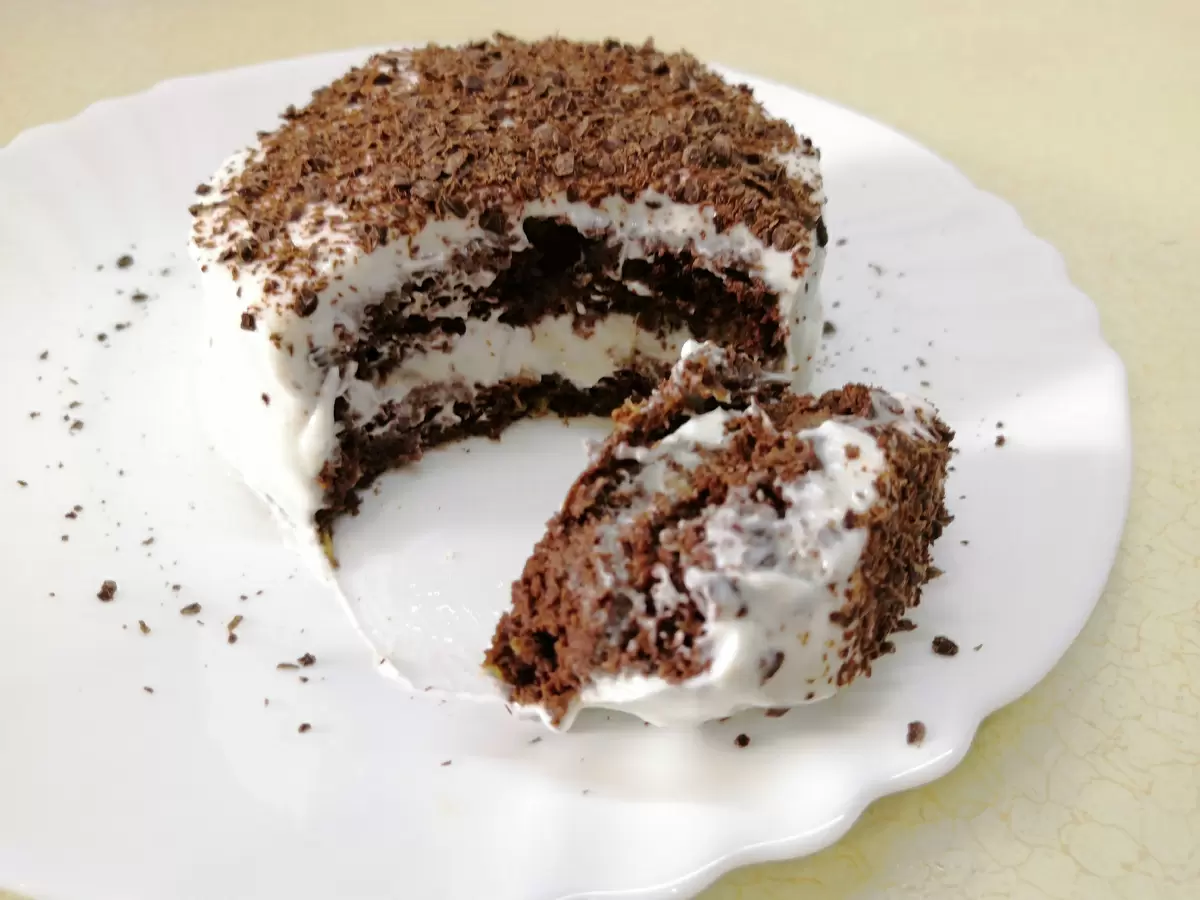 После того как бисквит остынет, разрежьте его пополам. Нанесите приготовленный крем на одну половинку, накройте второй и не забудьте обильно промазать верх и боковые стороны. Для украшения можно использовать тертый горький шоколад. Можно подавать сразу или оставить на несколько часов в холодильнике для лучшего распаривания.