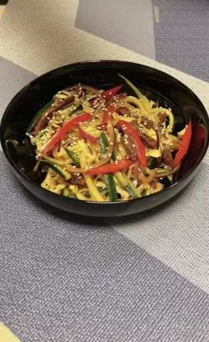 В зависимости от предпочтений, остроту салата можно регулировать, добавляя больше или меньше соусов. Далее нарезанные овощи выкладывают в салатник, добавляют говядину с соусом и аккуратно перемешивают. Для сладкого акцента добавляется сахарный сироп, который легко приготовить, смешав сахар с водой в равных пропорциях и доведя до кипения.
