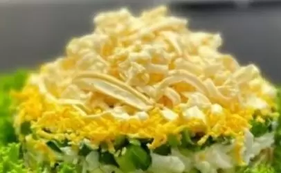 Подготовка: В первую очередь отваривают яйца, охлаждают их и очищают. Горбушу открывают, сливают жидкость и разминают вилкой, убирая возможные косточки. Яблоко очищают и натирают на крупной терке, а для сохранения цвета стоит сбрызнуть его лимонным соком. Сыр и яйца также натирают, а лук мелко режут.