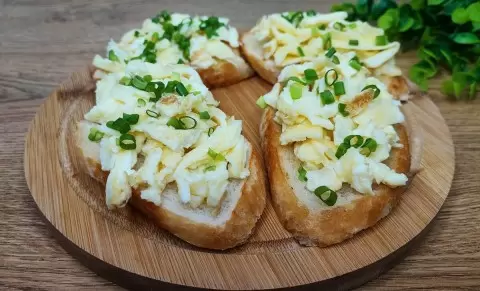 Когда яйца достигнут нужной консистенции, аккуратно выложите их на поджаренные ломтики батона. Сверху посыпьте мелко порубленным зелёным луком для дополнительного аромата и вкуса.