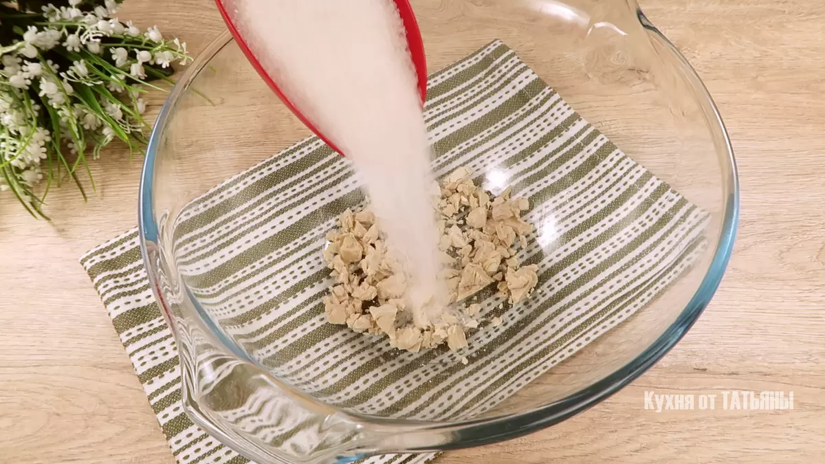 Приготовление начинается с подготовки всех продуктов, которые должны быть комнатной температуры. В миске соединяются прессованные дрожжи, сахар и теплое молоко (38 градусов). Смесь тщательно перемешивается венчиком до получения однородной массы.