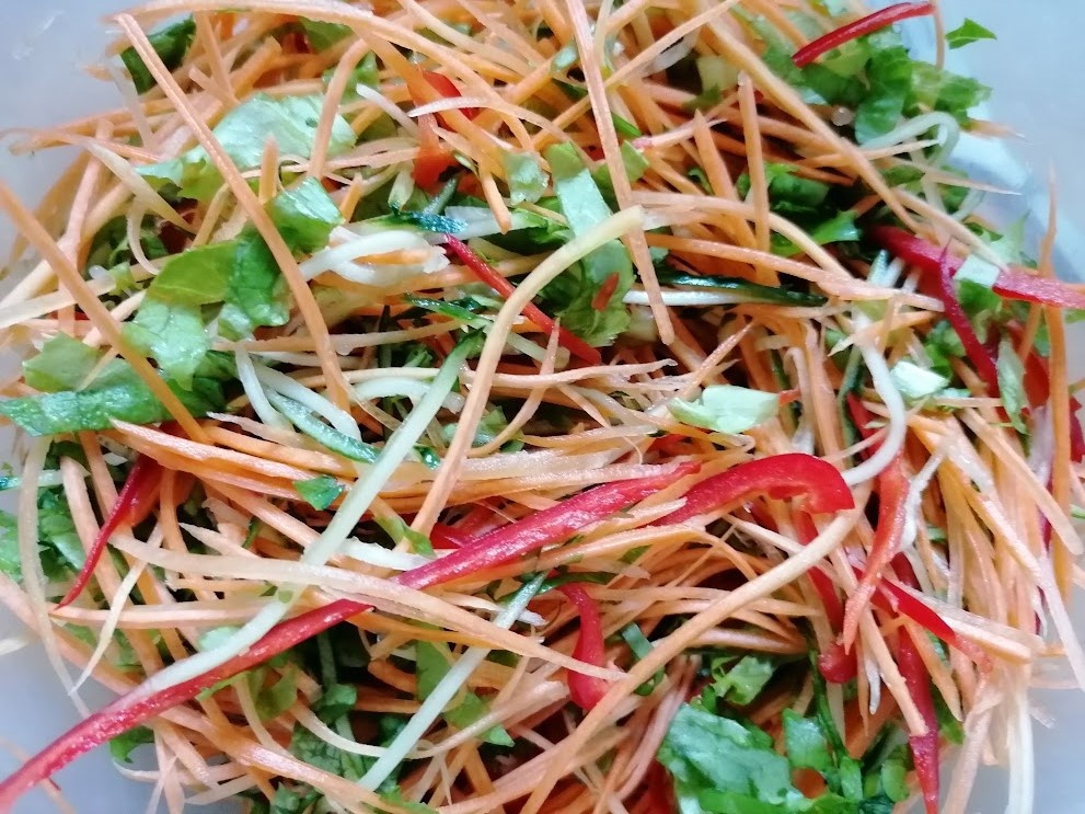 Смешайте овощи с заправкой перед подачей, чтобы они оставались хрустящими и свежими. Этот легкий салат станет отличным дополнением к любому основному блюду, добавив нотку экзотики и яркости вашему столу.