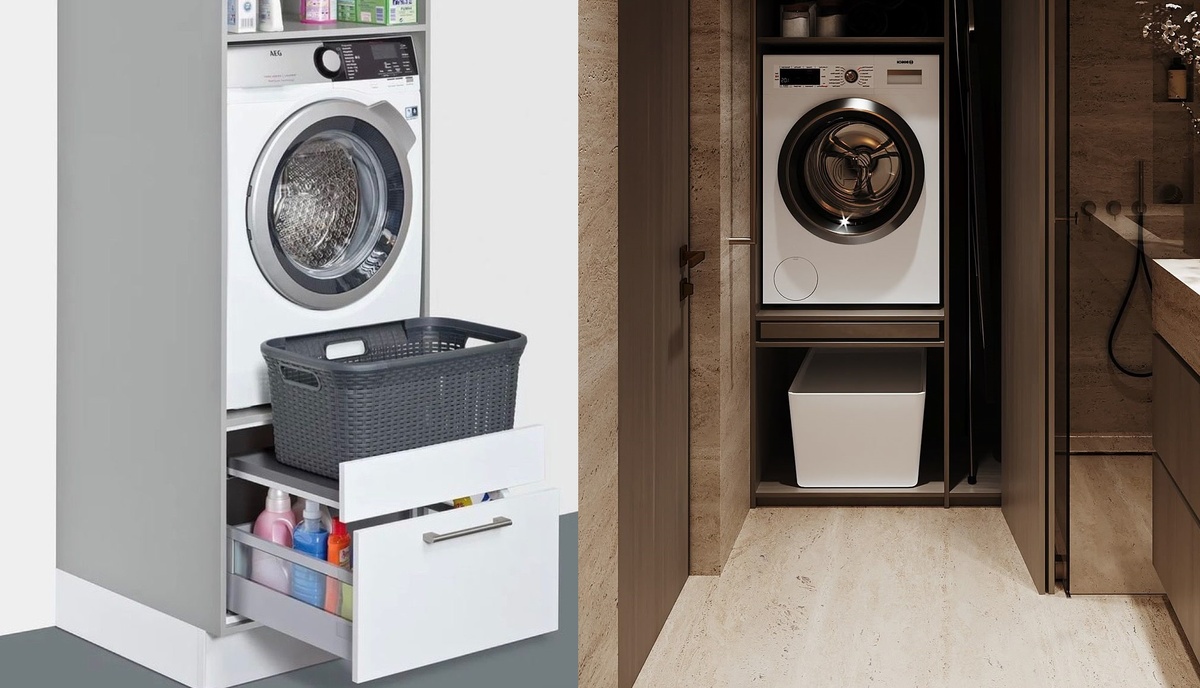Цоколь для стиральной машины. Наклоняясь, чтобы достать мокрое белье, многие сталкиваются с неудобством традиционного размещения стиральной машины на уровне пола. Решением является установка подставки, которая поднимет дверцу на уровень груди, не требуя лишних усилий. Под ней можно разместить корзину для грязной одежды и отдел для порошков, превращая пространство в удобный функциональный уголок.